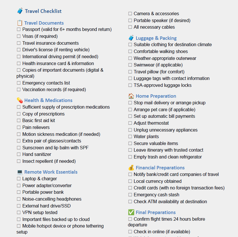 This isn’t just a list – it’s a travel companion that helps you stay organized and stress-free, no matter how complex your journey.